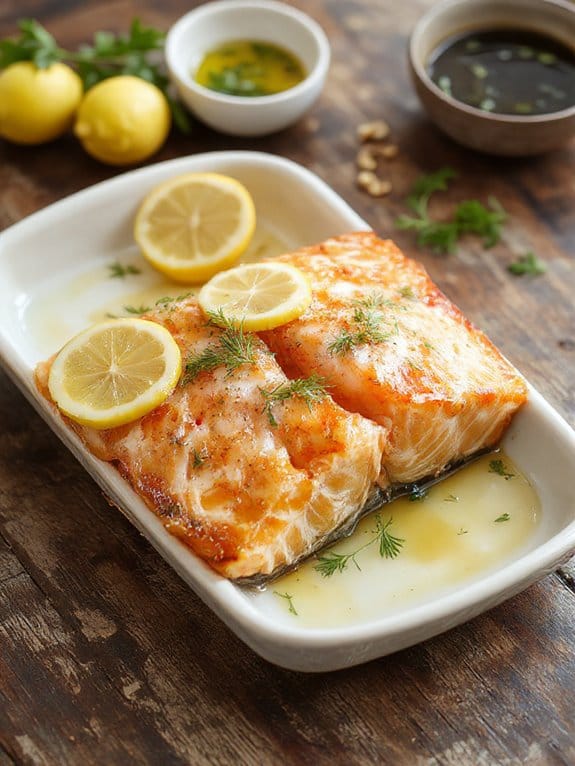 Since baked salmon is such a versatile dish, you’ve got plenty of wine options that’ll make it shine. I love pairing it with a crisp white wine like Sauvignon Blanc or Chardonnay—their bright acidity complements the fish’s richness. If you prefer red wine, go for a light Pinot Noir; its subtle fruitiness won’t overpower the salmon’s delicate flavor profiles. My top pairing tip? Match the wine to your sauce or seasoning—think citrusy whites for lemon-dressed salmon or earthy reds for herb-crusted fillets. Experiment, and you’ll find the perfect match every time!