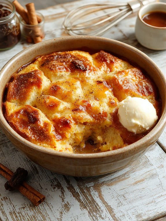 If you’re looking to balance the sweetness of bread pudding, savory sides can be a game-changer. I love pairing it with cheese options like sharp cheddar or creamy brie—they add a rich, tangy contrast that’s hard to resist. Herb seasonings, such as rosemary or thyme, can also elevate the dish, giving it a fresh, earthy flavor. Sometimes, I’ll serve it with a simple arugula salad dressed in lemon vinaigrette for a light, zesty bite. These combinations not only complement the pudding but also make the meal feel more complete. Trust me, it’s a match made in savory heaven!