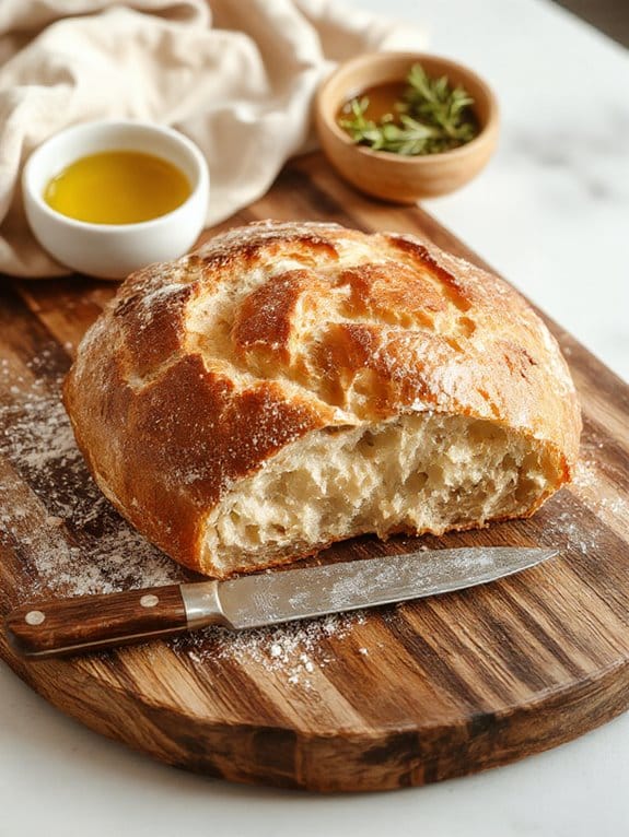 Fresh bread doesn’t just stand alone—it’s a team player that makes every dish around it better. I love pairing sourdough with soups or stews; its tangy flavor and chewy texture soak up broths perfectly. Garlic bread, on the other hand, is a classic side for pasta or salads, adding a savory kick. I’ve found that sourdough benefits include being easier to digest, which makes it a great choice for hearty meals. For lighter options, I’ll serve fresh bread with olive oil and balsamic vinegar or a simple cheese board. It’s amazing how versatile bread can be!