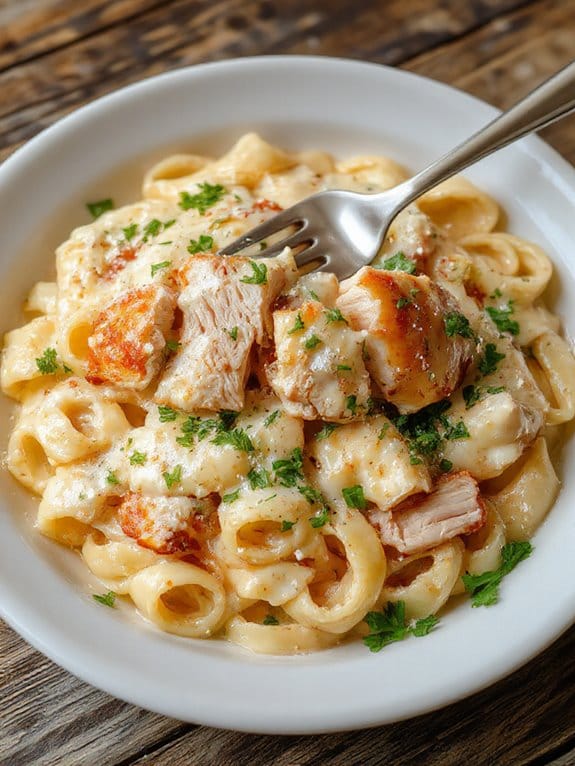 When I’m making chicken alfredo, I can’t help but think about how garlic bread just completes the meal. I love experimenting with garlic types—roasted garlic adds a mellow sweetness, while fresh garlic gives a bold kick. For bread variations, I usually go for a crusty baguette, but sometimes I’ll use ciabatta or even sourdough for a tangy twist. Spreading a mix of butter, herbs, and garlic, then toasting it until golden, creates that perfect crunch. It’s simple, but it’s the kind of side that makes everyone reach for seconds. Trust me, it’s worth the extra step!