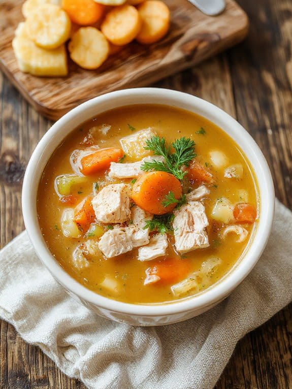 When you’ve got a steaming bowl of chicken noodle soup, nothing completes the meal quite like a slice of crusty bread—it’s perfect for soaking up every last drop. I love pairing it with crusty bread types like baguettes, sourdough, or ciabatta, each adding its own texture and flavor. If you’re feeling adventurous, try baking your own! My go-to bread baking tips include using a hot oven, adding steam for that crispy crust, and letting the dough rest properly. There’s something so satisfying about tearing into a warm, homemade loaf alongside a comforting bowl of soup. It’s a match made in heaven!