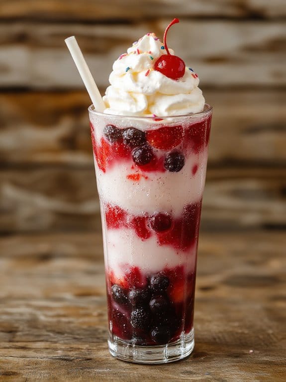 There’s nothing quite like pairing a revitalizing fruit soda float with a sweet treat to make the experience even more delightful. I love experimenting with delicious pairings that complement the fruity flavors of the soda. A warm, gooey chocolate chip cookie is my go-to—it’s a classic that never disappoints. For something lighter, I’ll grab a slice of lemon pound cake, which adds a tangy twist. If I’m feeling fancy, I’ll serve it with a mini fruit tart, letting the fresh berries echo the soda’s taste. These combos turn a simple float into a mini celebration, and I’m here for it!