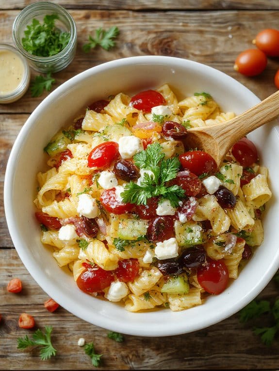 To make your pasta salad even more vibrant and nutritious, fresh vegetables are a must. I love using seasonal vegetables because they’re at their peak flavor and add a crisp, colorful touch. Think crunchy bell peppers, juicy cherry tomatoes, or shredded carrots—they’re all fantastic fresh ingredients. I often toss in some cucumbers for extra crunch or zucchini for a mild, invigorating bite. Don’t forget leafy greens like spinach or arugula for a peppery kick. Mixing in these veggies not only boosts the texture but also makes the dish feel lighter and more satisfying. It’s an easy way to make your salad shine!