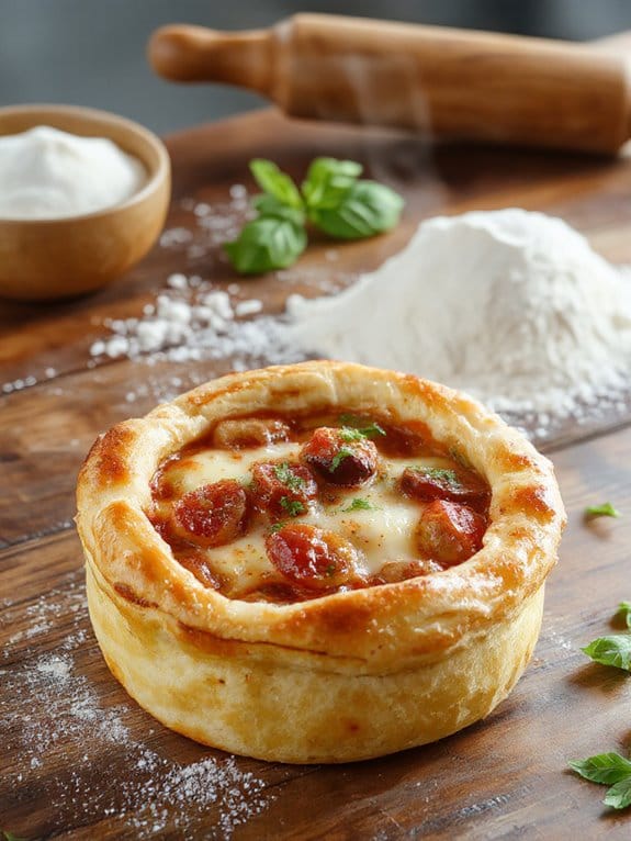 Though pizza pot pies are hearty on their own, I’ve found that pairing them with the right sides can turn a simple meal into something special. For creative sides, I love serving a crisp Caesar salad or garlic knots—they add texture without overpowering the main dish. Flavorful accompaniments like roasted veggies or a tangy antipasto salad bring balance, while a warm bowl of tomato soup feels cozy and nostalgic. Don’t forget a sprinkle of Parmesan on top! These choices keep things interesting but easy, letting the pot pies shine while rounding out the meal perfectly.