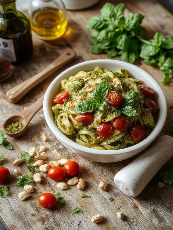 To make your summer pesto pasta meal even more satisfying, adding a grilled protein can take it to the next level. I love tossing chicken, shrimp, or even steak on the grill—it adds smoky flavor that pairs perfectly with fresh pesto. For juicy results, try simple grilling techniques like preheating the grill and flipping just once. Marinating your protein beforehand makes a huge difference; my go-to is lemon-garlic for chicken or a quick herb mix for shrimp. Don’t forget to let the meat rest before slicing! Trust me, it’s worth the extra step for a meal that’ll wow everyone.